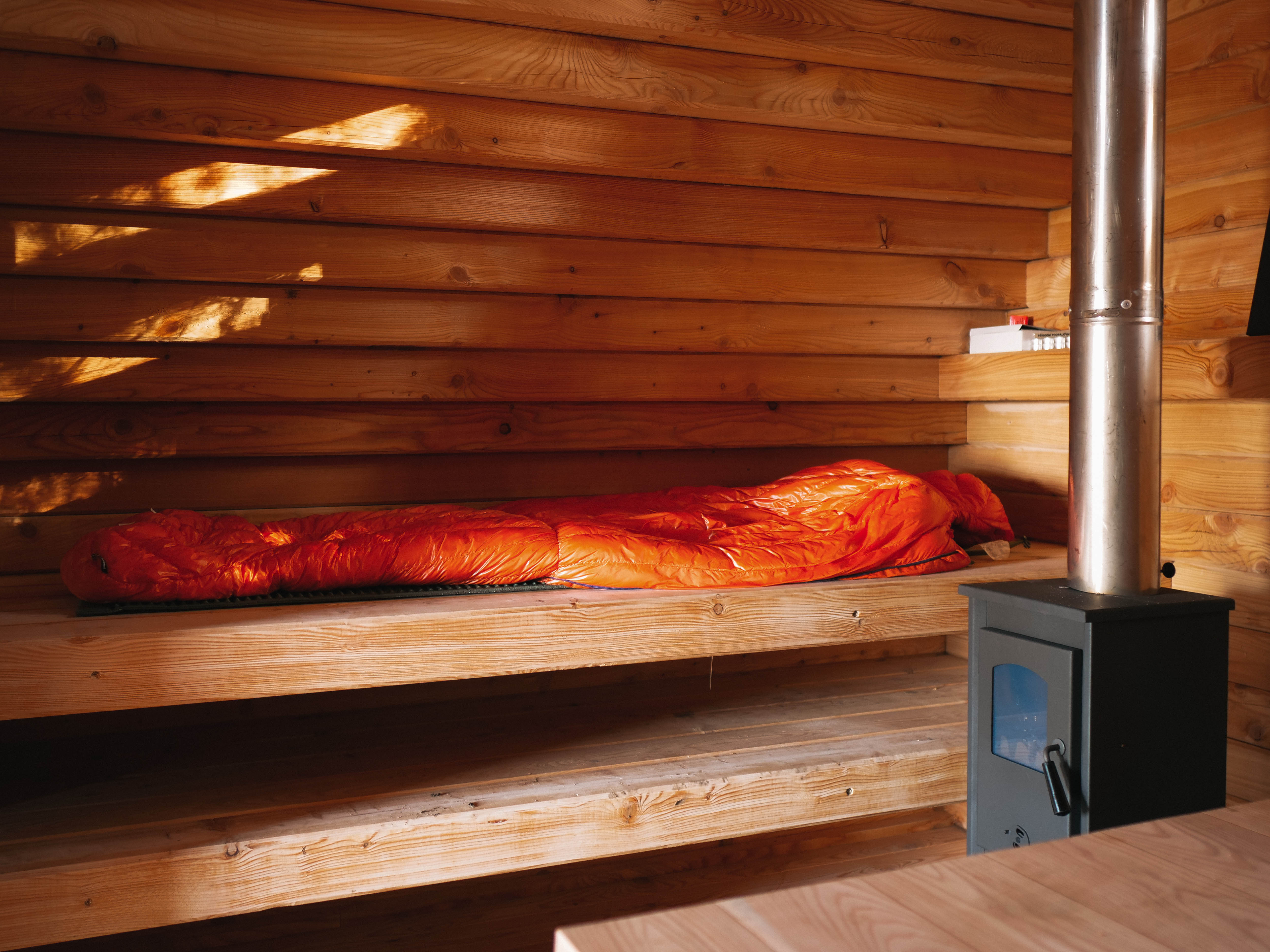 Útulňa stojí na nízkej kamennej podmurovke a je orientovaná štítom kolmo k terénu.